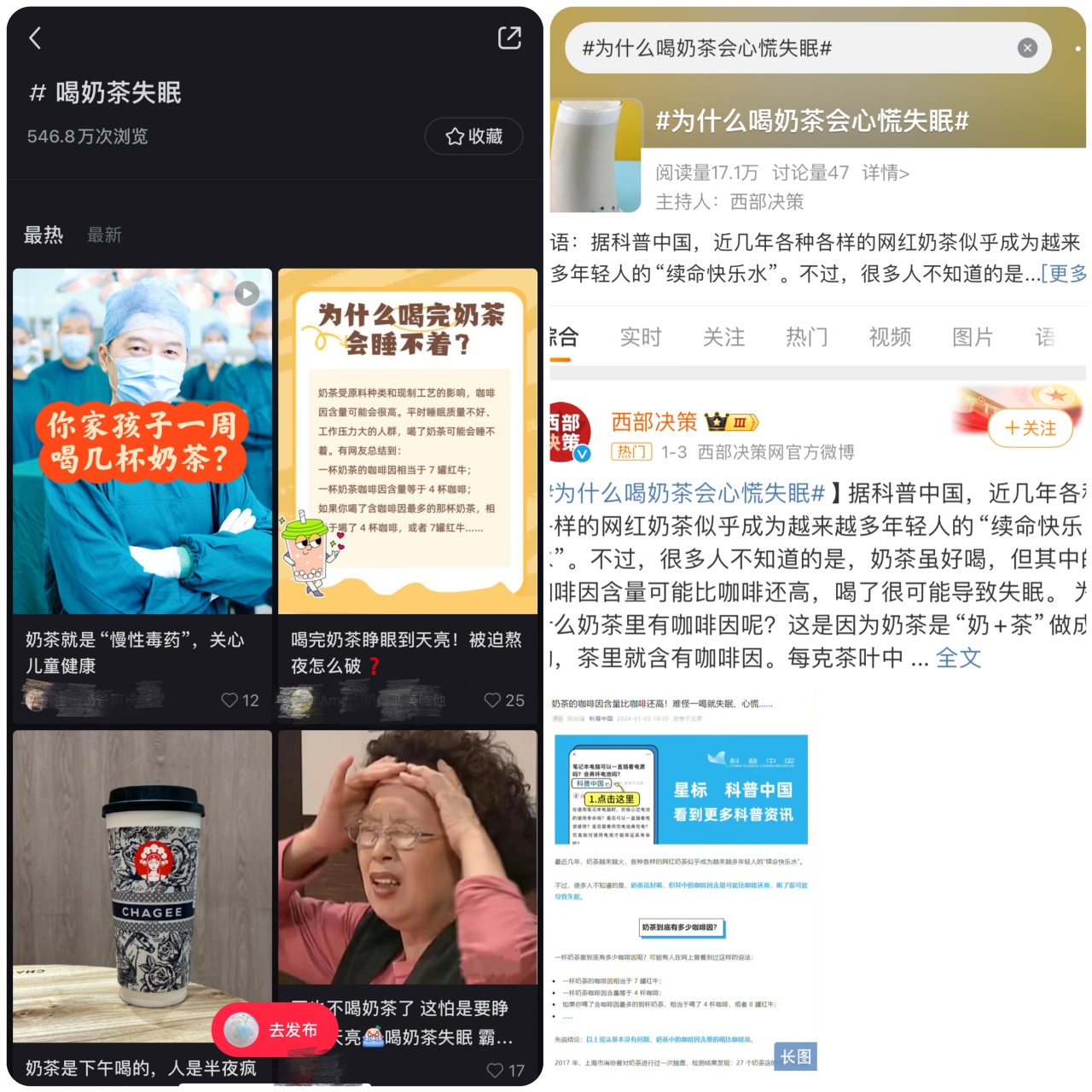 相关社交平台上,“#喝奶茶失眠”“#为什么喝奶茶会心慌失眠”的话题浏览量较大