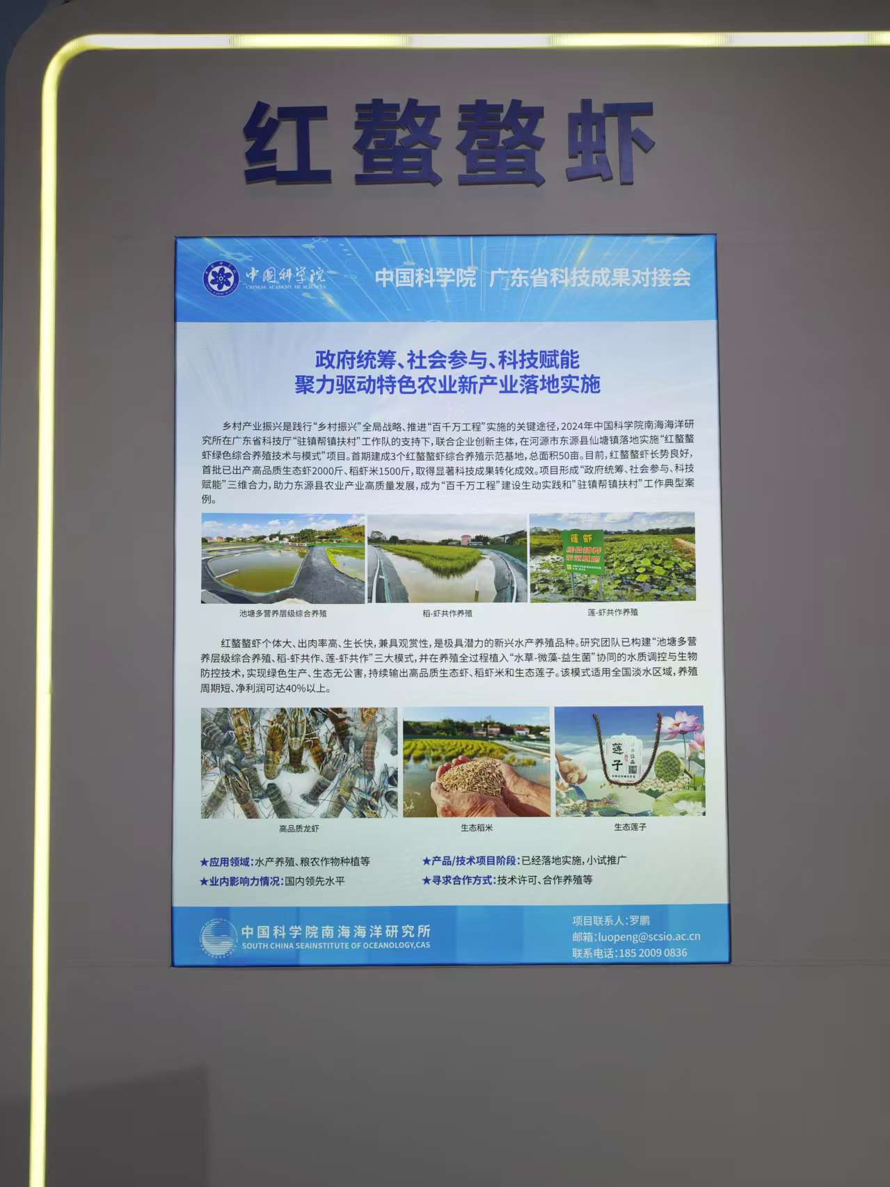 一年前,2024大湾区科学论坛期间举行了首届“中国科学院 广东省科技成果对接会”,省科技厅、省贸促会、广东工业大学驻仙塘镇帮镇扶村工作队到场参观,一下就看中了中国科学院南海海洋研究所的红螯螯虾科研成果。广东工业大学驻河源市仙塘镇仙塘村第一书记汤猛说,当时工作队把项目引进河源市东源县,开展示范养殖。“ 去年的大湾区科学论坛当时我们工作队也是到了现场,发现这个虾非常适合我们的帮扶需求,东江水是二类活水,水源非常优质,所以我们工作队就把这条虾引进到东源。”